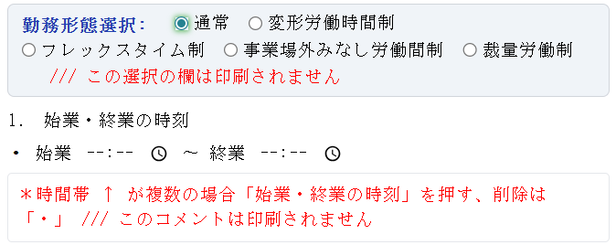 「フレックスタイム制」を適用している場合は、空欄埋めや選択ボタンにより運用を明示します。