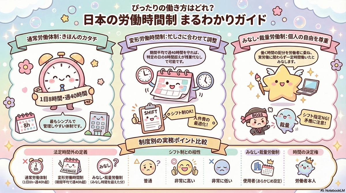 うーん、なかなかのものを作ってくれたNotebookLMのStudioのインフィグラフィックと思っていたが、良く考えると、会社に管理職認定(誤認?)されると時間外も休日労働もないのか。うーん?